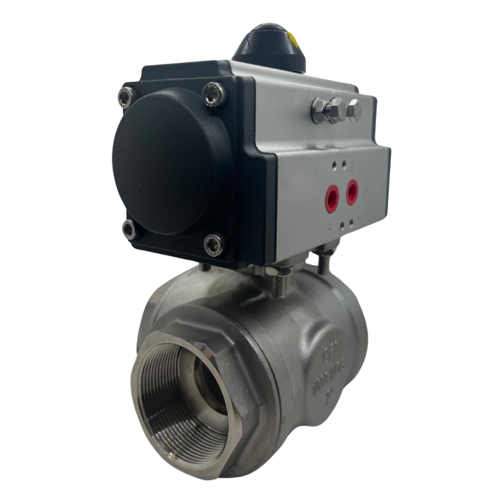 Válvula Esfera 3 Vias Fluxo L Rosca BSP DN50 2" POLEGADAS Inox 304 com Atuador Pneumático Dupla Ação AT63DA